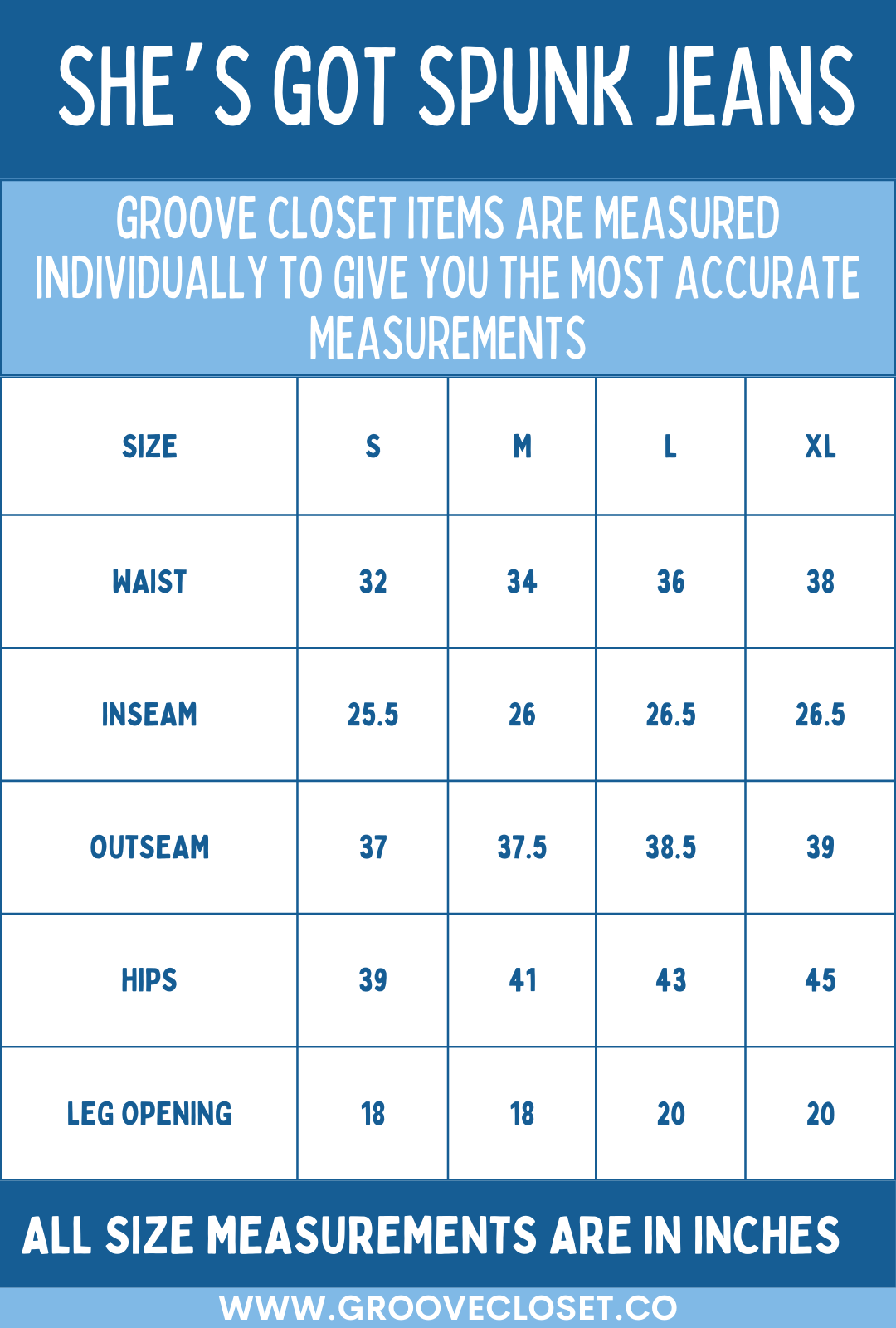 Size chart Size chart for She's Got Spunk Patch Barrel Jean