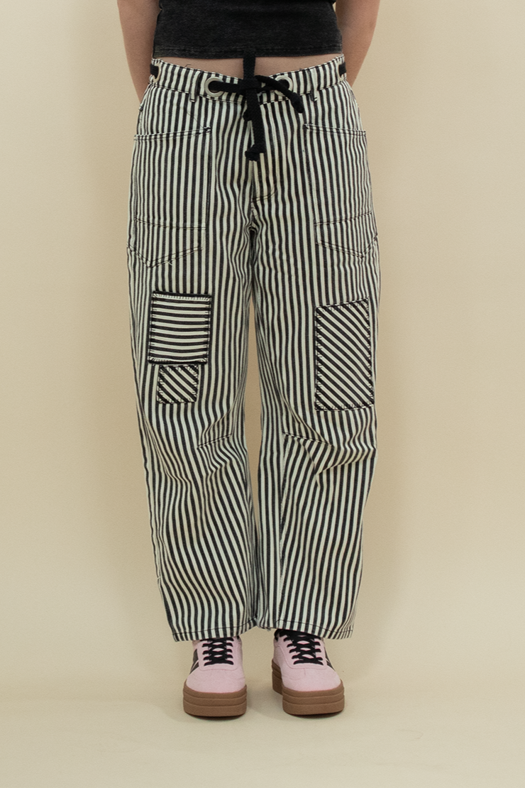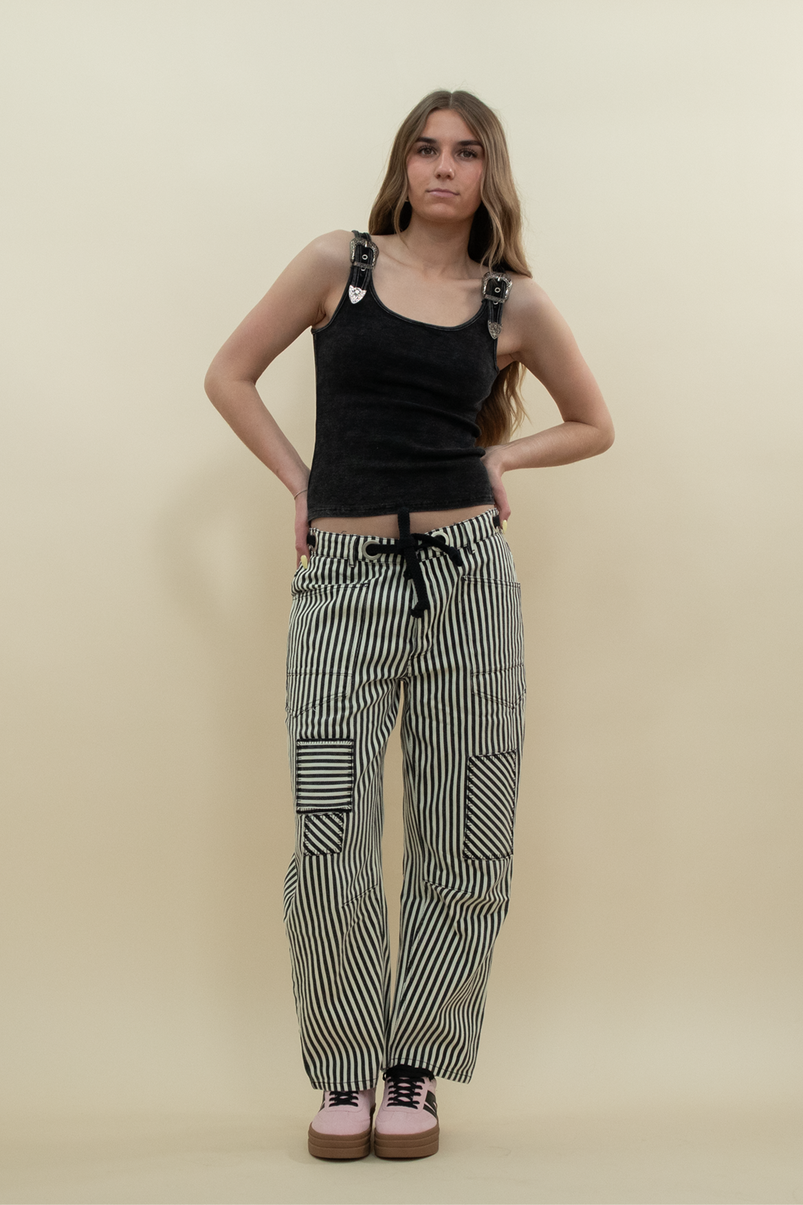 Woman wearing black and white striped barrel jeans with patchwork detail, styled with a black tank top and pink platform sneakers – Groove Closet product photo.